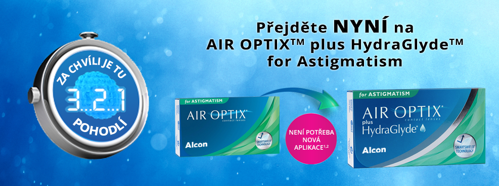 Zajímá vás, jaká je vylepšená verze čoček AIR OPTIX? Jde o AIR OPTIX plus HydraGlyde for Astigmatism a AIR OPTIX plus HydraGlyde Multifocal s vylepšenými funkcemi a větším pohodlím díky zvlhčující látce HydraGlyde.