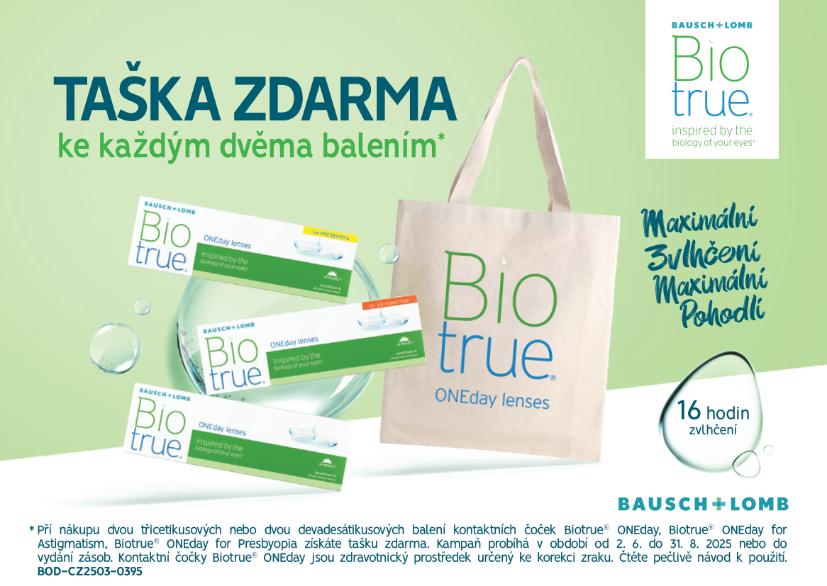 Kromě komfortu teď získáte i praktický letní dárek: Při nákupu dvou třicetikusových nebo dvou devadesátikusových balení čoček Biotrue® ONEday – včetně variant Biotrue® ONEday for Astigmatism a Biotrue® ONEday for Presbyopia – od nás dostanete plátěnou tašku s logem Biotrue® ONEday zdarma.