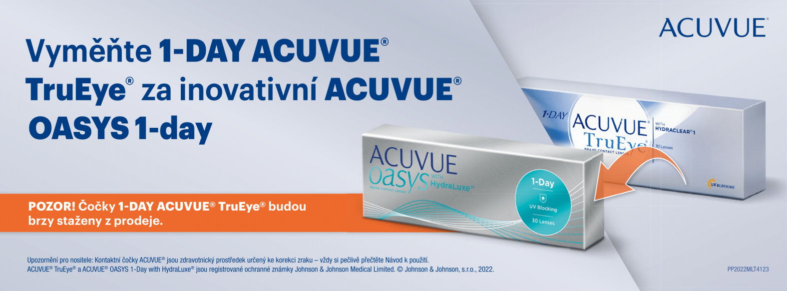 Všichni nositelé jednodenních kontaktních čoček 1-DAY ACUVUE® TruEye® by měli být na pozoru: Během roku 2022 bude postupně plně ukončena výroba čoček 1-DAY ACUVUE® TruEye® a na konci roku se budou doprodávat již jen poslední skladové zásoby.