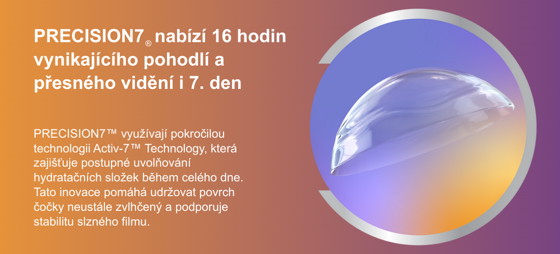 Představujeme Vám PRECISION7™ – revoluční týdenní kontaktní čočky navržené pro život v pohybu. Pokud hledáte zlatou střední cestu mezi jednodenními a měsíčními čočkami, PRECISION7™ nabízejí špičkovou optiku, nekompromisní hygienu a pohodlí, které vydrží celých 7 dní.